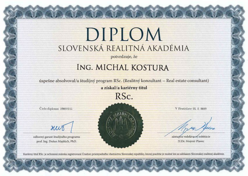 RSc. štúdium – prestížny realitný študijný program s komplexnými a unikátmi informáciami z realitnej, právnej, finančnej, katastrálnej, daňovej a stavebnej oblasti. Po úspešnom štúdiu absolventi získajú kariérny titul RSc.