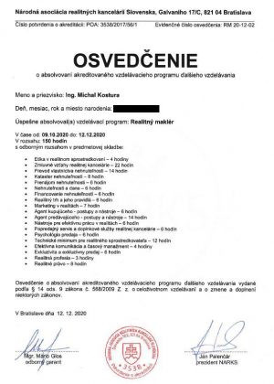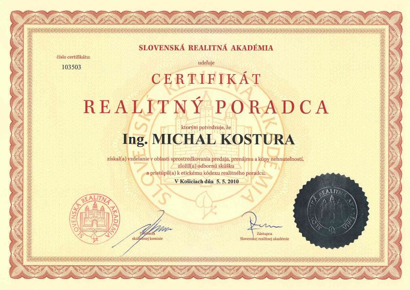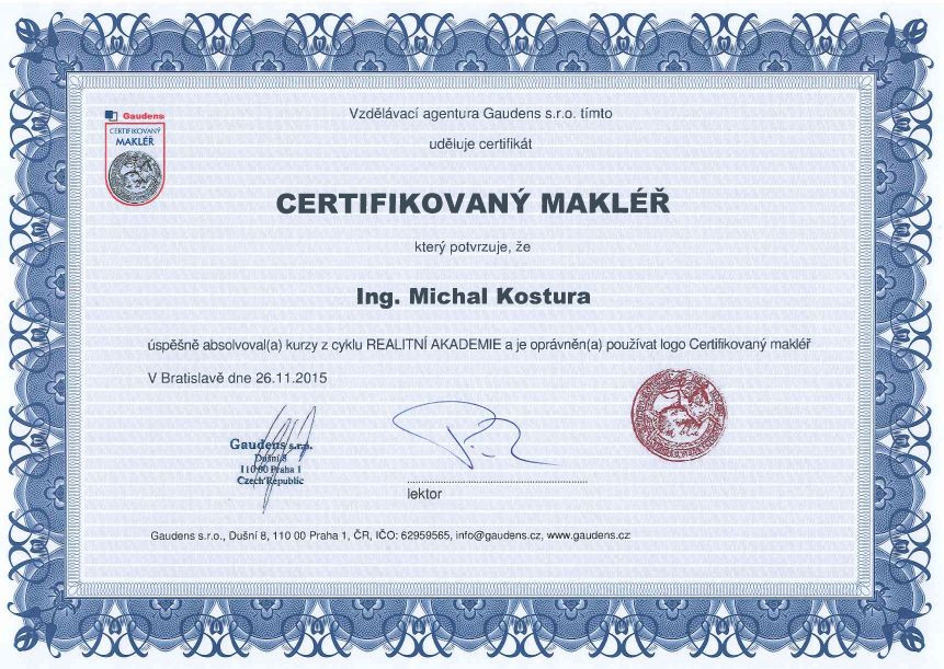 Realitná činnosť je zo zákona viazaná živnosť. Absolvovanie kurzu umožňuje získanie viazanej realitnej živnosti, ktorá poskytuje úspešnému absolventovi oprávnenie podnikať na území SR v oblasti realít.Kurz je akreditovaný Ministerstvom školstva vedy výskumu a športu SR.