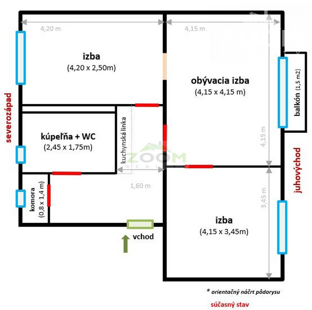 Orientácia bytu: severozápad (kuchyňa, izba, kúpeľňa, špajza), juhovýchod (obývacia izba, spálňa),