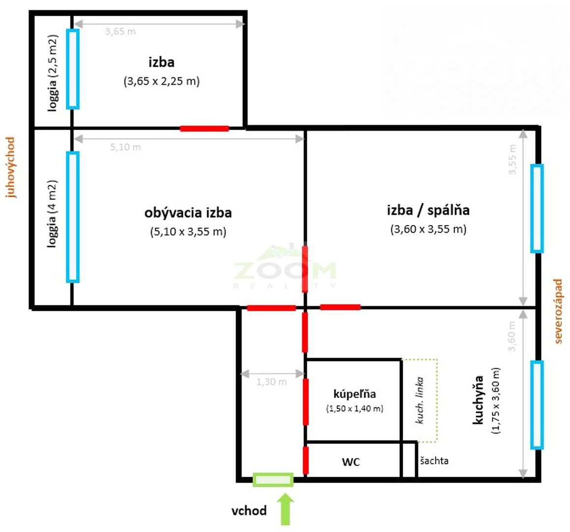 Orientácia bytu: severozápad (kuchyňa, izba), juhovýchod (obývacia izba, izba, 2x loggia),