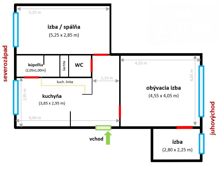 – dispozičná zmena – otvorenie priestoru medzi chodbou a kuchyňou, kompletná zmena dispozície bytového jadra,