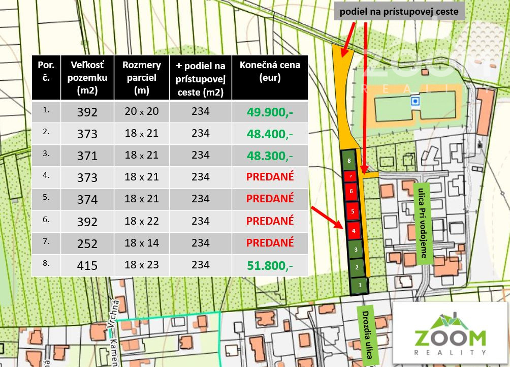 V cene sú zahrnuté aj podiely na ďalších dvoch spoločných parcelách, ktoré budú tvoriť prístupovú cestu k hlavnej verejnej ceste, čo znamená, že ku každému pozemku pripadá aj podiel vo výmere 234 m2 a je zahrnutý do konečnej ceny pozemku.